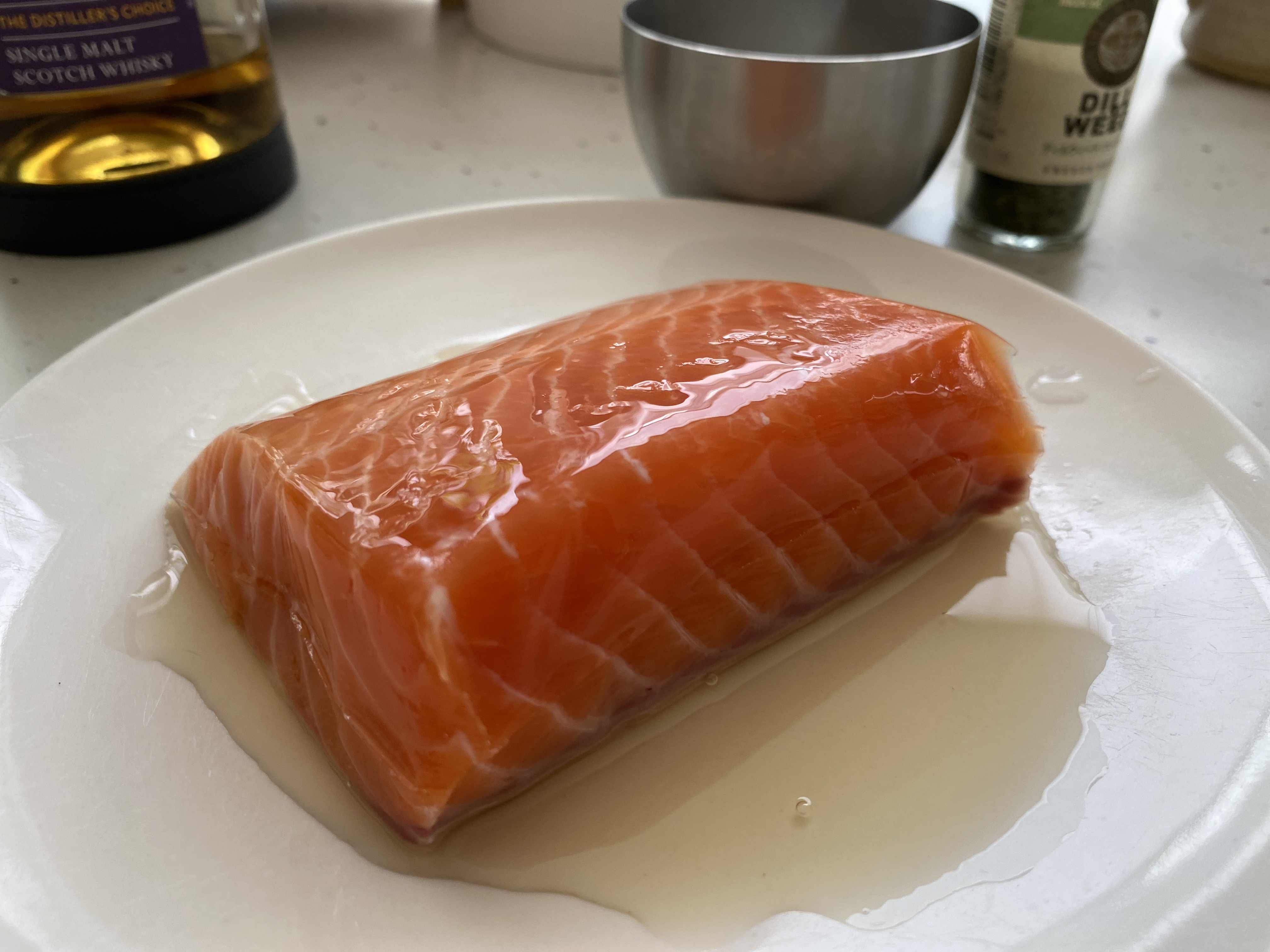 Place the salmon on a large plate and douse with schnapps. Flip it once to make sure you have a decent coating.