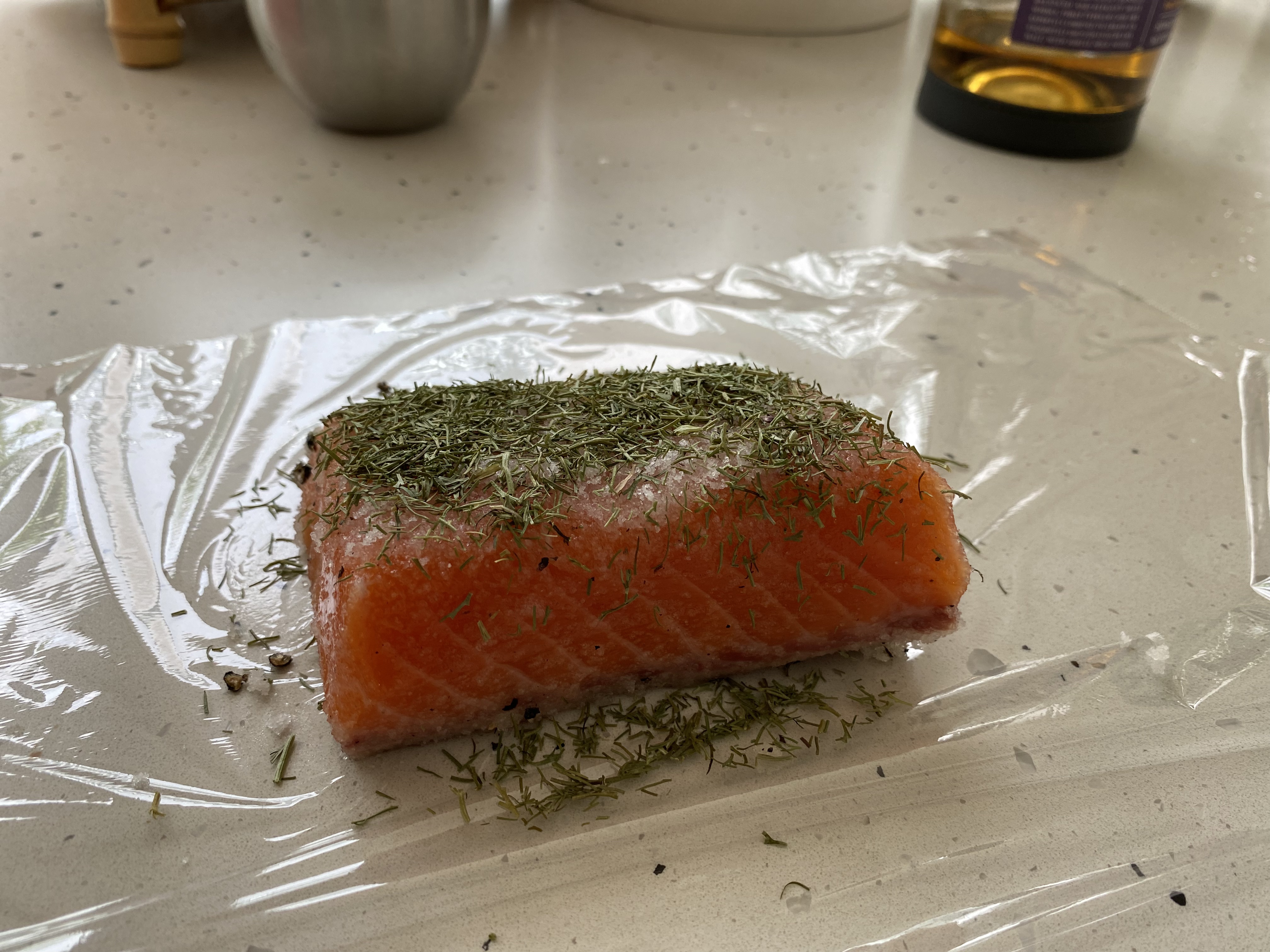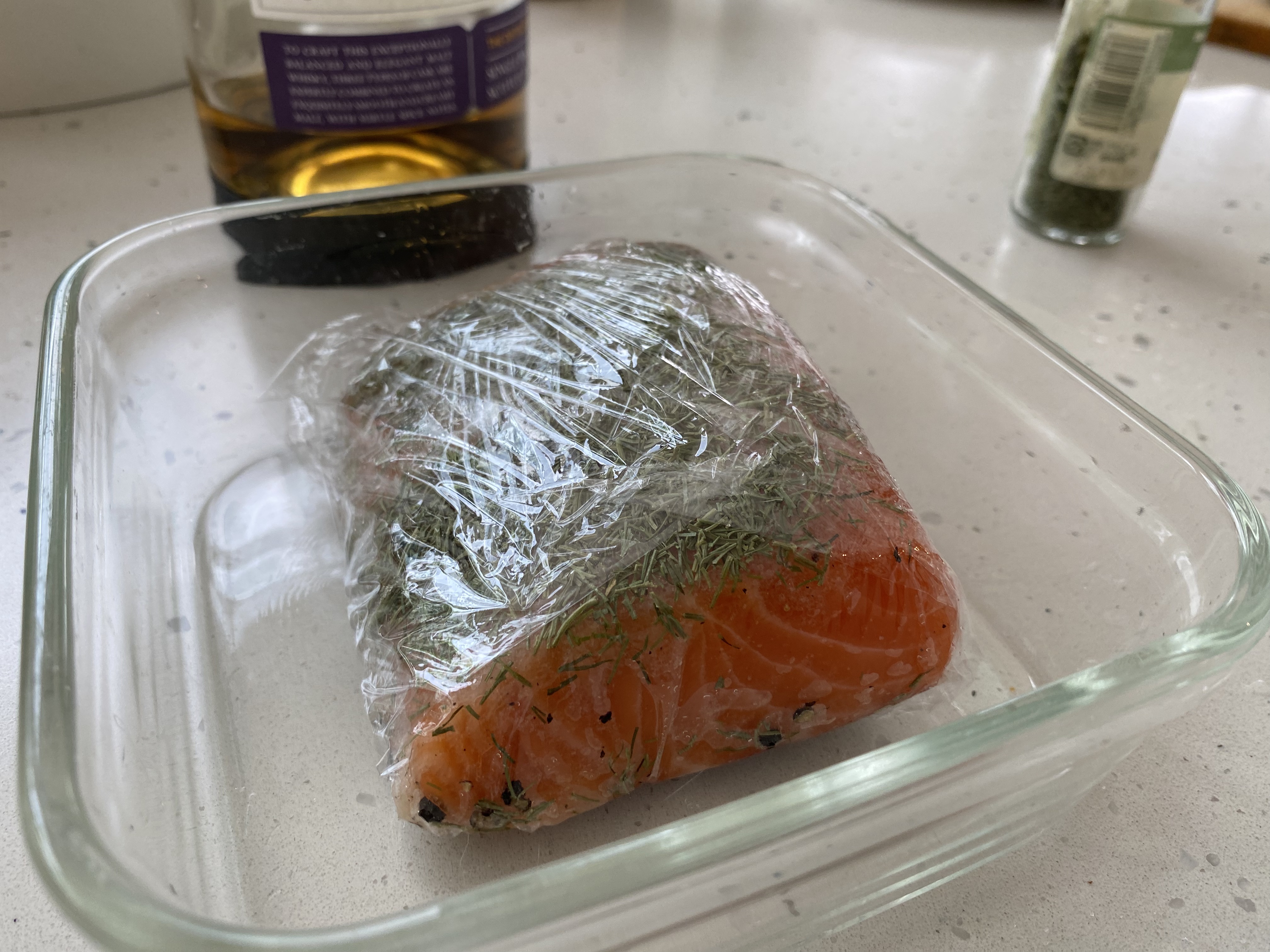 Place in Tupperware in the fridge at least overnight, and up to three nights for deeper curing. For an elevated finish unwrap the fish after the first night and place back in the fridge on a drying rack for one more night. This will form a beautiful “pellicle” layer of slightly darker orange that really shows when you slice it up.